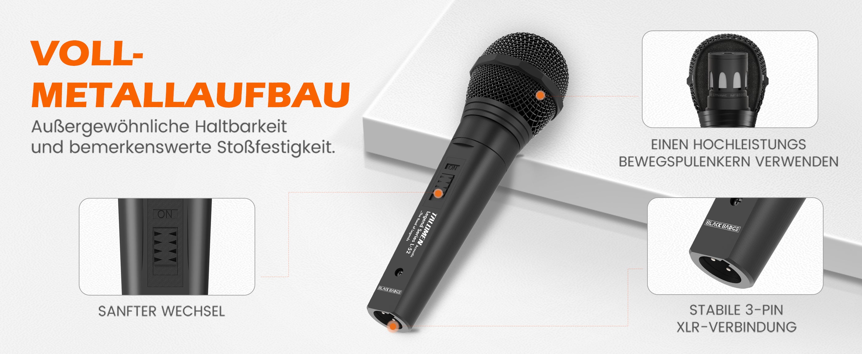 Das Talomen L52 ist ein dynamisches Mikrofon mit Supernierencharakteristik, das mit zwei Audiokabeln geliefert wird und mit allen Mikrofonen mit 6,35-mm-Eingängen und XLR-Eingängen kompatibel ist. Die Black Badge-Version ist in mattschwarzem Metall ausgeführt.