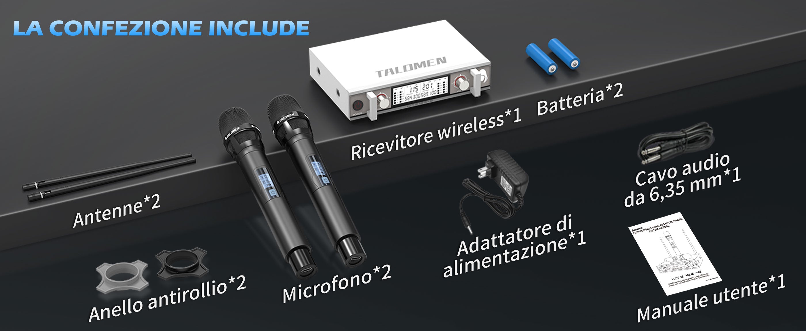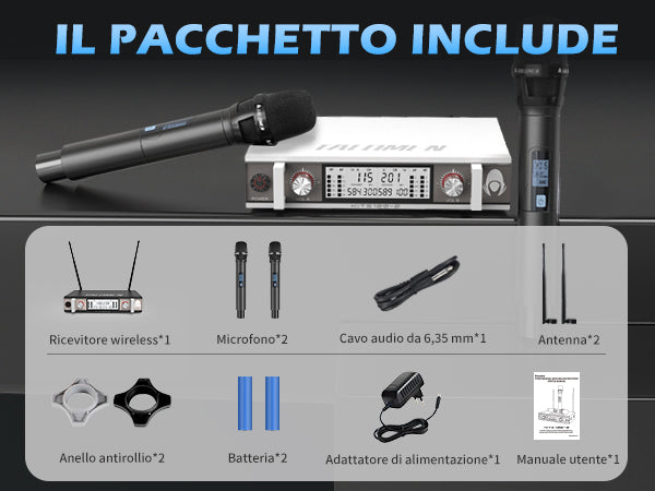 Il Talomen K120 è un sistema microfonico wireless UHF a doppio canale. Include un ricevitore con antenna personalizzata e due microfoni dinamici sintonizzati professionalmente. È perfetto per funzioni religiose, serate karaoke, feste in casa e molto altro ancora.